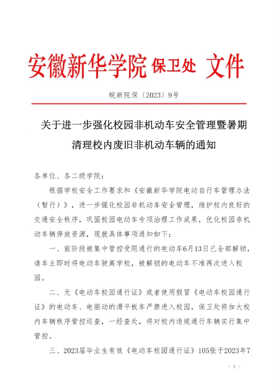 关于进一步强化校园非机动车安全管理暨暑期清理校内废旧非机动车辆的通知