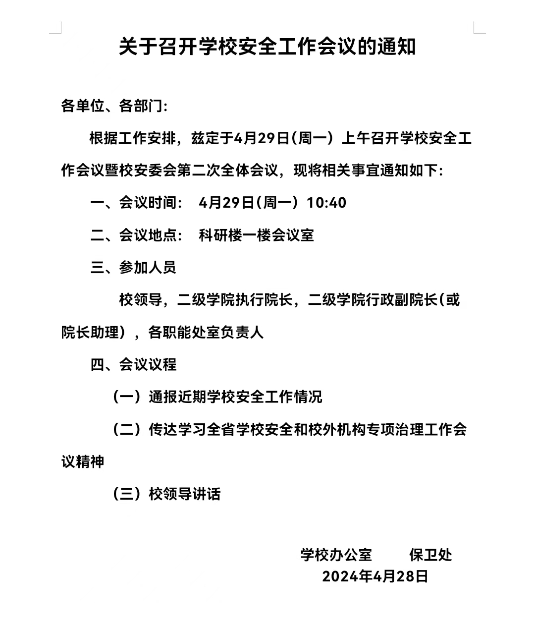 关于召开学校安全工作会议的通知