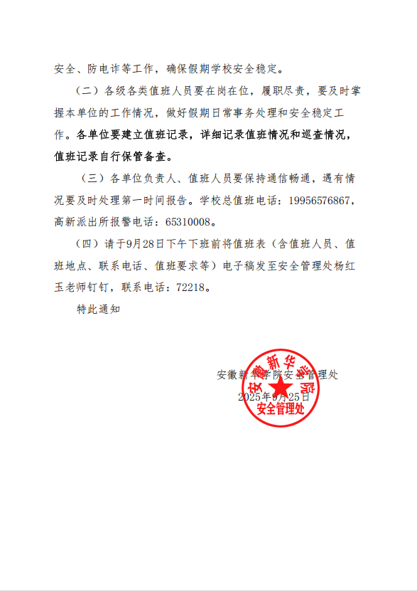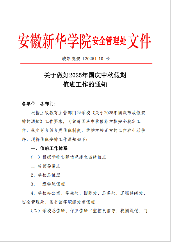 皖新院安〔2025〕10 号 关于做好2025年国庆中秋假期值班工作的通知