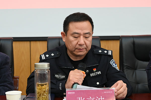 义警队员张瑞奇代表全体义警队员发言,作为一名义警志愿者,深感既光荣又荣幸,一定要严格要求自己,努力提高业务能力,积极参与校园治安防控,为平安华园建设贡献自己的力量。