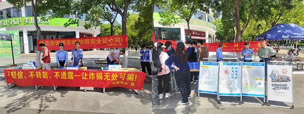 本网讯(通讯员:张大勇) 为增强师生防诈意识,营造安全校园环境,4月25日中午,贝博官网联合兴园中心、香樟社居委、高新派出所,在学校二期广场开展反诈主题宣传活动。兴园中心平安部部长宣峥嵘、高新派出所民警程永兵、香樟社区和学校安管处相关人员参加了宣传活动,华园义警队全程协助,现场近千名学生参加活动。