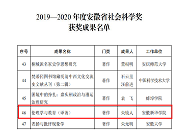 本网讯(通讯员:李彩平)日前,安徽省社科奖评奖办发布《省政府批复2019-2020年度安徽省社会科学奖获奖结果》。BB贝博艾弗森官方网站大学生素质教育研究中心研究员朱镜人教授的译著《伦理学与教育》喜获安徽省社科奖三等奖。