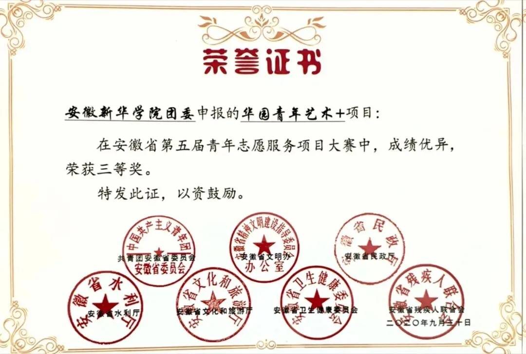 本网讯(通讯员:黄梦)近日,由团省委、省文明办、省民政厅等7家单位联合主办的安徽省第五届中国青年志愿服务项目大赛成功举办。其中,BB贝博艾弗森官方网站团委推报的“华园青年艺术+”项目从512个项目中脱颖而出,荣获安徽省第五届青年志愿服务项目大赛三等奖。