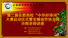 本网讯(通讯员:司长安)11月5日上午,第二届在肥高校“中华好诗词”大赛启动仪式暨安徽省作家协会主席许辉讲座在贝博官网学术报告厅举行。本次活动由全国高校文学社团联合会、共青团BB贝博艾弗森官方网站委员会主办,贝博官网科技学院晨风文学社和学生社团联合会承办。