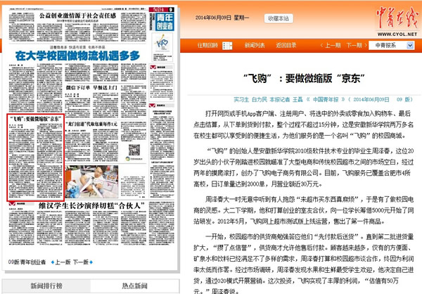 本网讯(通讯员:姚欣) 6月9日出版的《中国青年报》刊登文章《“飞购”:要做微缩版“京东”》,报道了贝博官网学子发起成立的飞购团队利用校园网络电子商务平台创业的事迹。