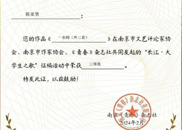 本网讯(通讯员:时绮滢)近日,由南京市作家协会、南京市文艺评论家协会、《青春》杂志社共同发起并面向全国大学生的“长江·大学生之歌”诗集征稿活动发布获奖名单,文化与传媒学院“华园创意写作中心”21级汉语言文学专业陈亚男同学的诗歌作品《一水间(外二首)》获得三等奖。