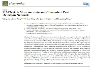 本网讯(通讯员:刘慧)近日,贝博官网人工智能目标检测研究团队王琦进教授的2021级硕士研究生胡雅婷以第一作者在SCI期刊《Electronics》在线发表了题为“MACNet: A More Accurate and Convenient Pest Detection Network”的研究论文(论文链接:https://doi.org/10.3390/electronics13061068)。据悉《Electronics》是国际知名期刊... 2024-03-18 贝博官网教师荣获2023年度安徽省高等学校网络安全和信息化工作先进个人称号