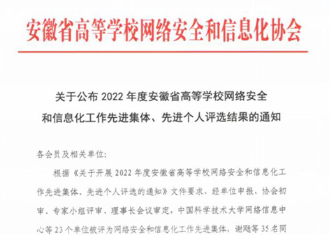 本网讯(通讯员:曲红)近日,安徽省高等学校网络安全和信息化协会发布《关于公布2022年度安徽省高等学校网络安全和信息化工作先进集体、先进个人评选结果的通知》,经过单位推荐、协会初审、专家评审和理事长审定,贝博官网信息化建设与发展中心王志荣获2022年度网络安全和信息化工作先进个人称号。