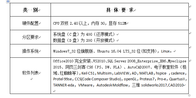 4桌面系统主要软件列表:Office2010完全安装、visual studio 2010、SQL Server 2008、Myeclipse 2015、网页三剑客CS6(PS、DW、FLA)、AutoCAD2007、电子教室软件(极域、红蜘蛛等),VS6.0,Keil C51,Multisim,LabVIEW,AD,MATLAB,hspice ,cadence,Protel 99se,CCS(Code Composer Studio),openGL,Proteus7,Pro-e,QuartusII,TANNER-eda,VMware,Autodesk Moldflow,三维solidworks2017,CAD2010,西门子step7 micro/win,组态王,西门子博图V14,winccMy Eclipse,