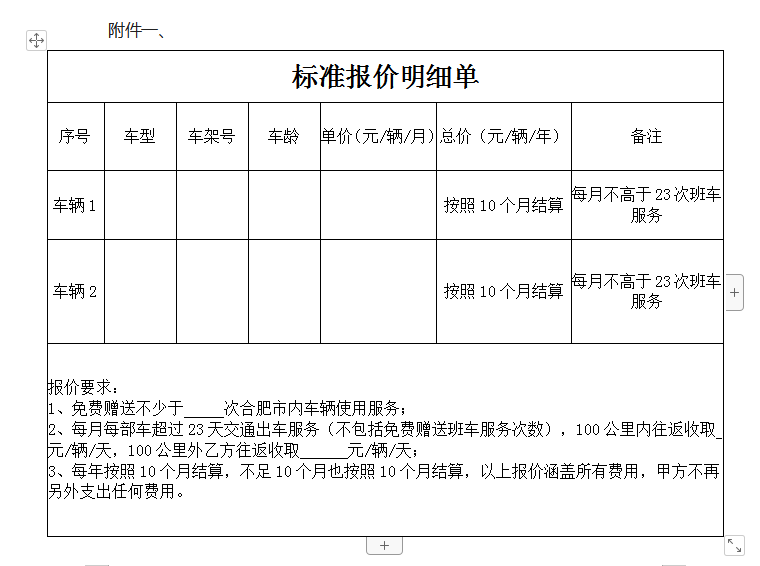 6、报价表:车辆品牌、规格型号、年限、报价 (标准格式见附件一)