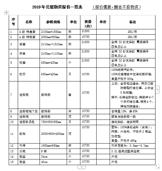 4、报价须知:可分项报价,报价含标的物价、增值税专用发票、包装、运输、自行下货到指定位置,(棉絮、三件套、脸盆、水瓶、竹席除外)