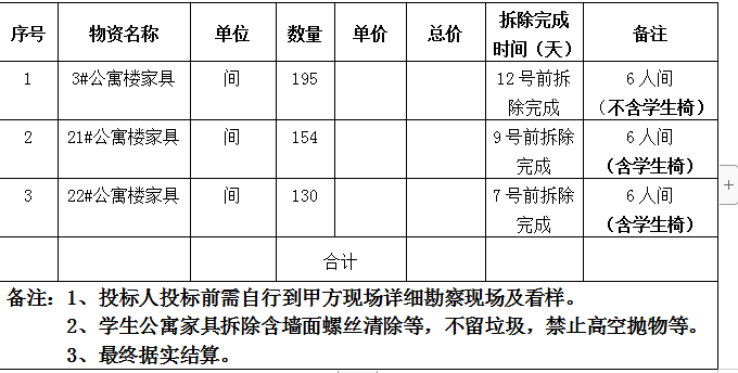 1、学生公寓家具需在规定时间内拆除并把房间清理干净。