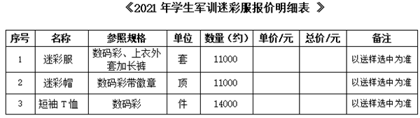 2021年学生军训迷彩服招标询价公告