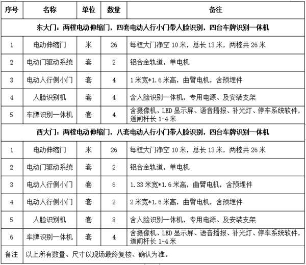 1.3 西大门电动伸缩2樘,安装车牌识别系统2进2出,共4套;
