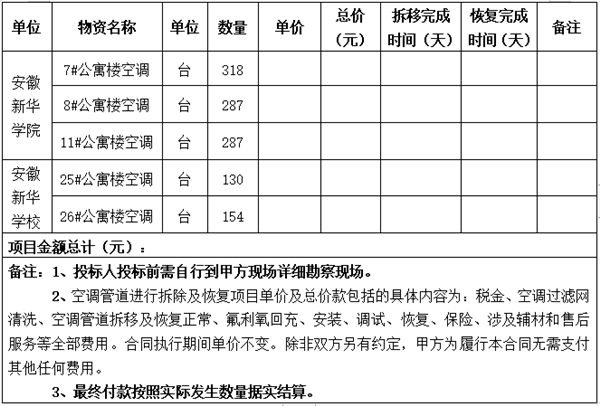 1)BB贝博艾弗森官方网站7#、8#、11#公寓楼和安徽新华学校的25#、26#公寓楼的空调内机拆移、安装恢复项目