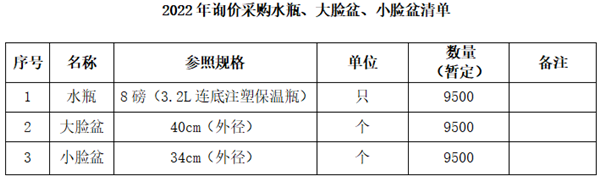 2022年学生公寓物品之水瓶、大脸盆、小脸盆询价公告