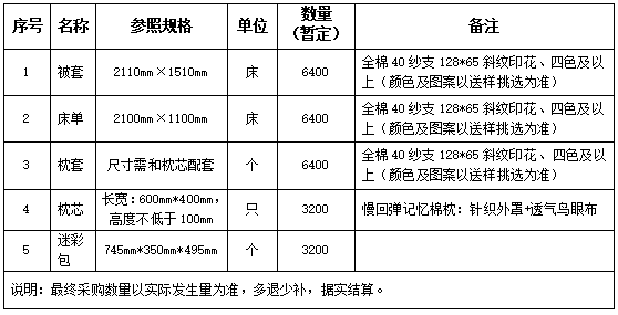 (2)第二包:2025年招标采购(被套、床单、枕套、枕芯和迷彩包)清单