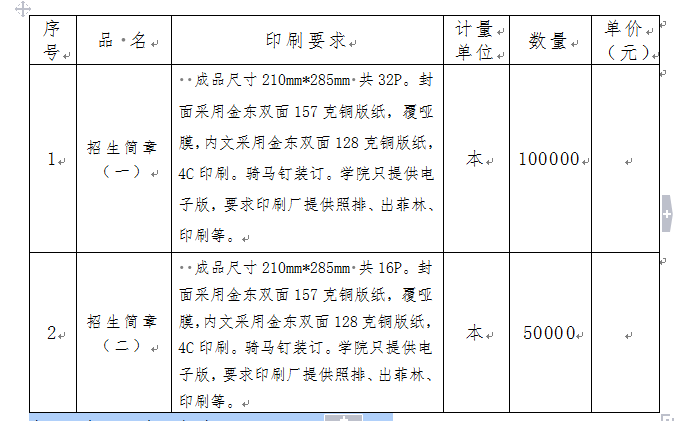 1、报价表(必须密封):报出每种规格印刷品的单价和总价及合计总价(含税、送货上门价)