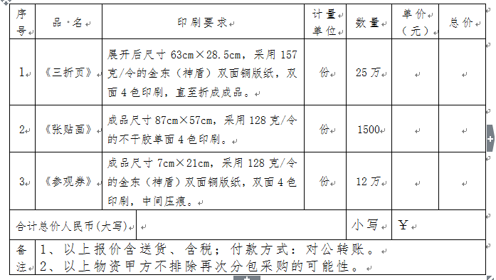 2、询价项目:《三折页》、《张贴画》、《参观券》。