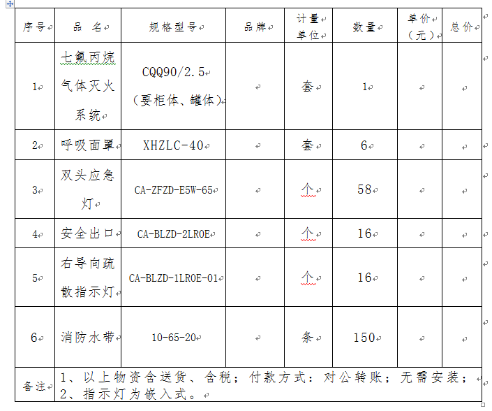 2、询价项目:七氟丙烷气体灭火系统、呼吸面罩、双头应急灯、安全出口、右导向疏散指示灯、消防水带。