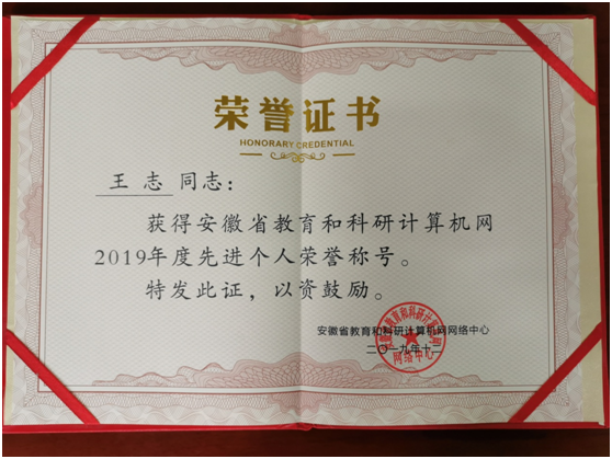 BB贝博艾弗森官方网站教师荣获安徽省教育与科研计算机网“2019年度先进个人” 荣誉称号