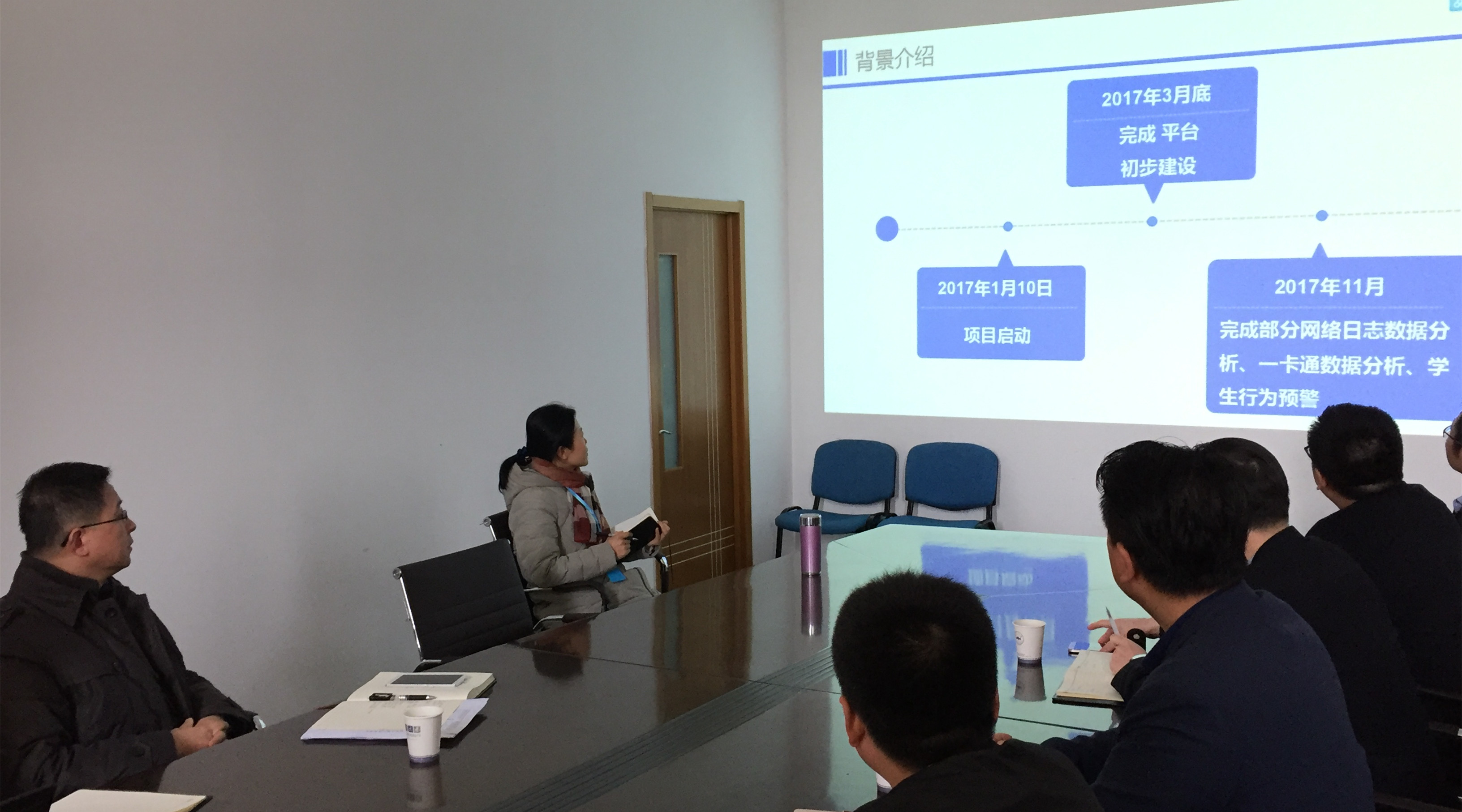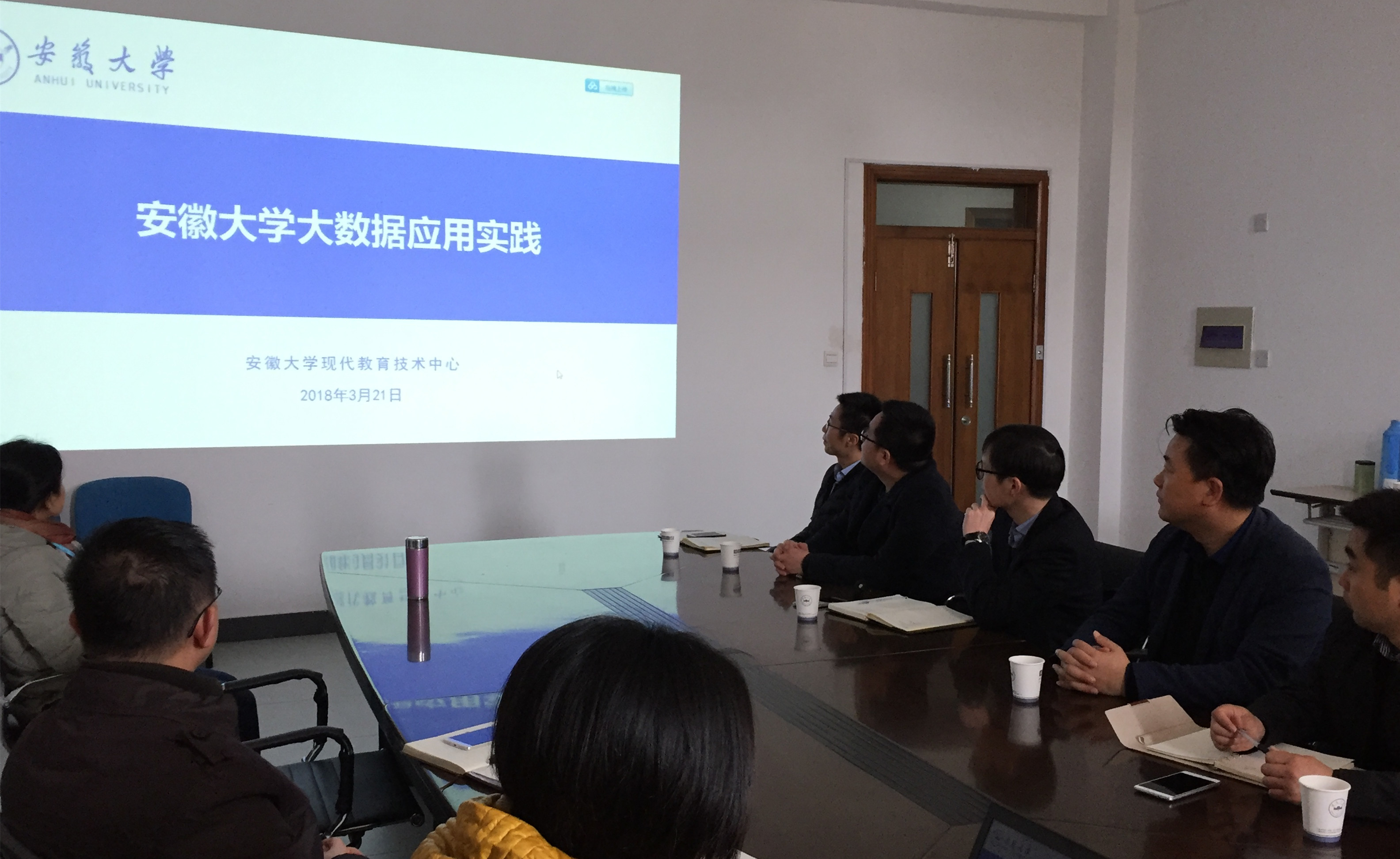 本网讯(通讯员:孔亮)为进一步深入推进贝博官网信息化建设,学习其他院校成功经验,结合近期拟建设的大数据平台及智慧资助项目,3月21日上午,信息化建设与发展中心负责人王志,采购处处长胡世暴,学生处处长助理齐军兵等一行5人赴安徽大学现代教育技术中心进行交流学习,中心主任郑健和相关人员接待了王志一行。