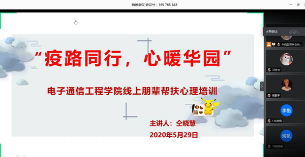 为构建抗疫心理防线,更好在复学后开展朋辈帮扶工作,以“疫情状态下,面对不良情绪,心理委员如何开展工作”为核心主题进行培训。培训分为:“疫情期间常见心理状态”、“疫情对我们产生的影响”、“疫情下,我们能做什么?”三个模块。