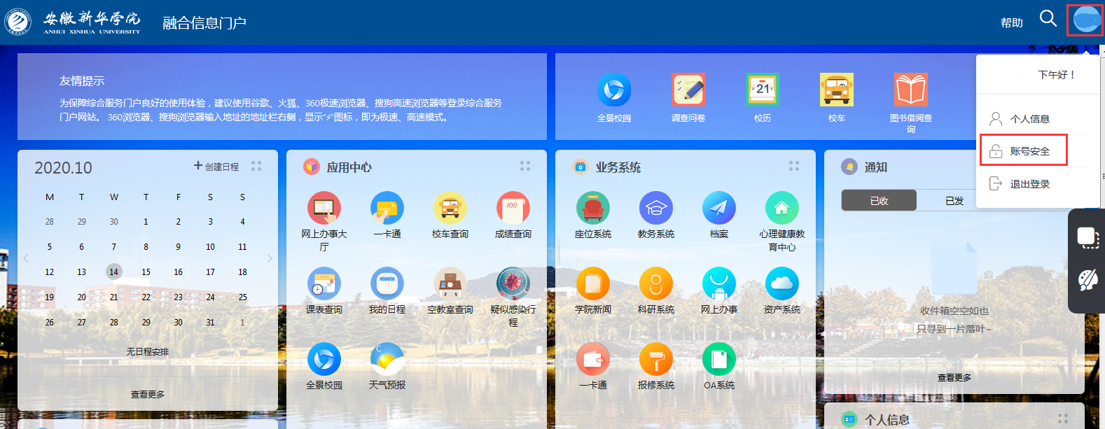 1、浏览器打开学院官网地址http:/ 点击最上端导航栏信息门户。信息门户的登录账号:工号,密码:身份证后六位,末位是X需大写。