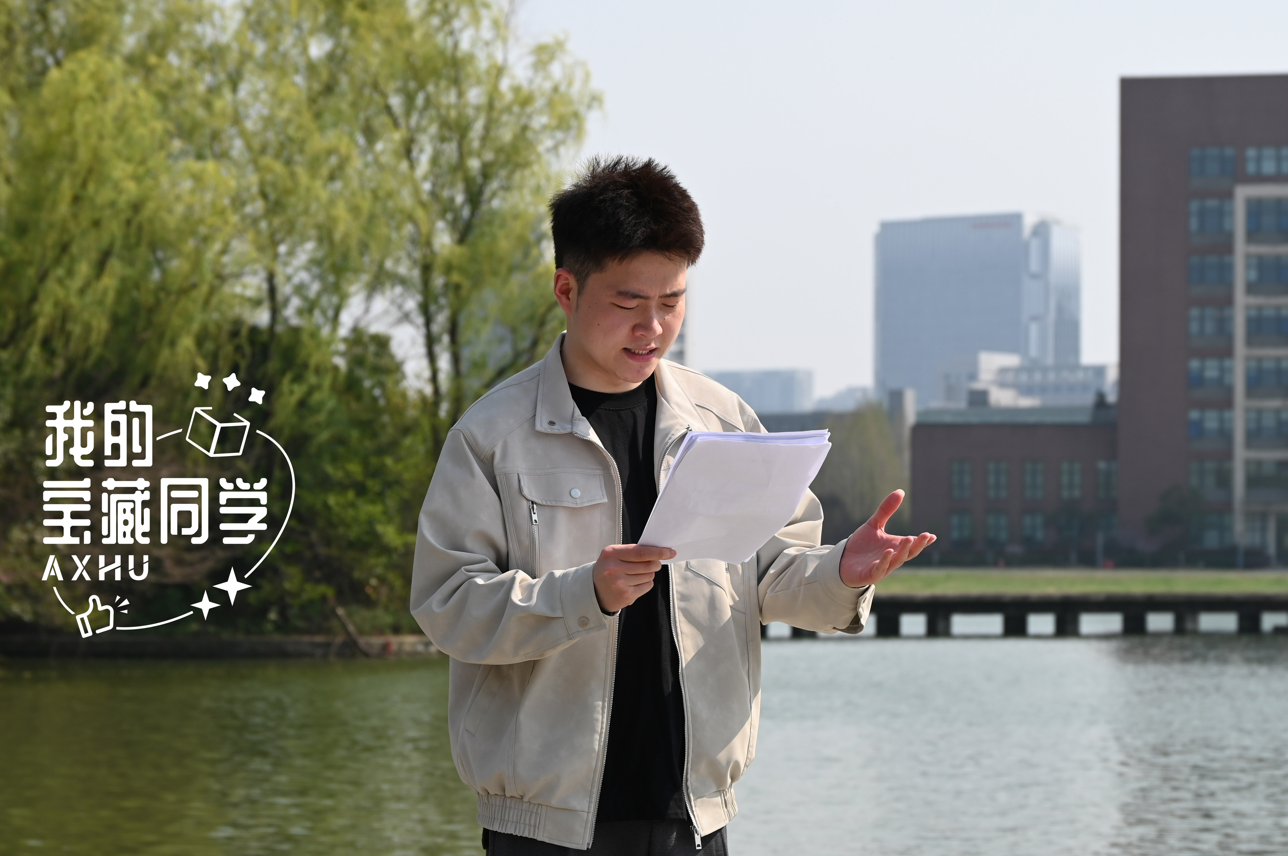 不过,当我们聊起他和播音主持的故事,杨杰还是以一种很真挚的态度向我们叙述。杨杰用“渊源”来形容他心中的热爱:“初中时一次的偶然机会,我朗诵的一篇《沁园春·雪》获得了老师的认可和引导,从那以后便走上这样一条漫长的、充满热爱的道路。”