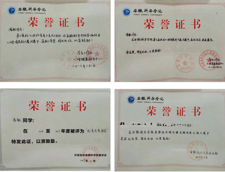 (1)本科期间曾获评“优秀团员”称号,校级“三好学生”,校园“心理情景剧”大赛获三等奖,药学院“政治思想汇报大赛”获优秀奖等荣誉;