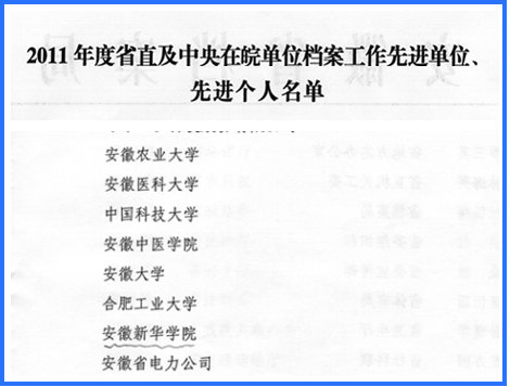 根据《安徽省档案局关于开展2011年度省直单位档案年鉴工作的通知》的要求,2011年8月份贝博官网提交了档案工作年度自查报告,12月底,省档案局对贝博官网档案工作进行了年度检查,并下发了《安徽省省直单位档案工作年检结论通知书》文件,贝博官网档案工作在安徽省高校中以90分获评优秀等级,并以此荣获先进单位称号。