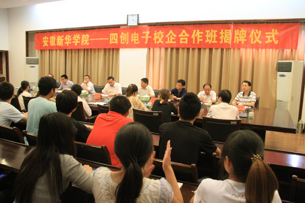 5月30日下午,电子通信工程学院“新华—四创电子校企合作班” 揭牌仪式在第一会议室举行。BB贝博艾弗森官方网站院长石秀和教授、四创电子党总支书记朱明辉出席会议。来自电子通信工程学院2011级应用电子、通信技术专业60余名学生代表参加了揭牌仪式。