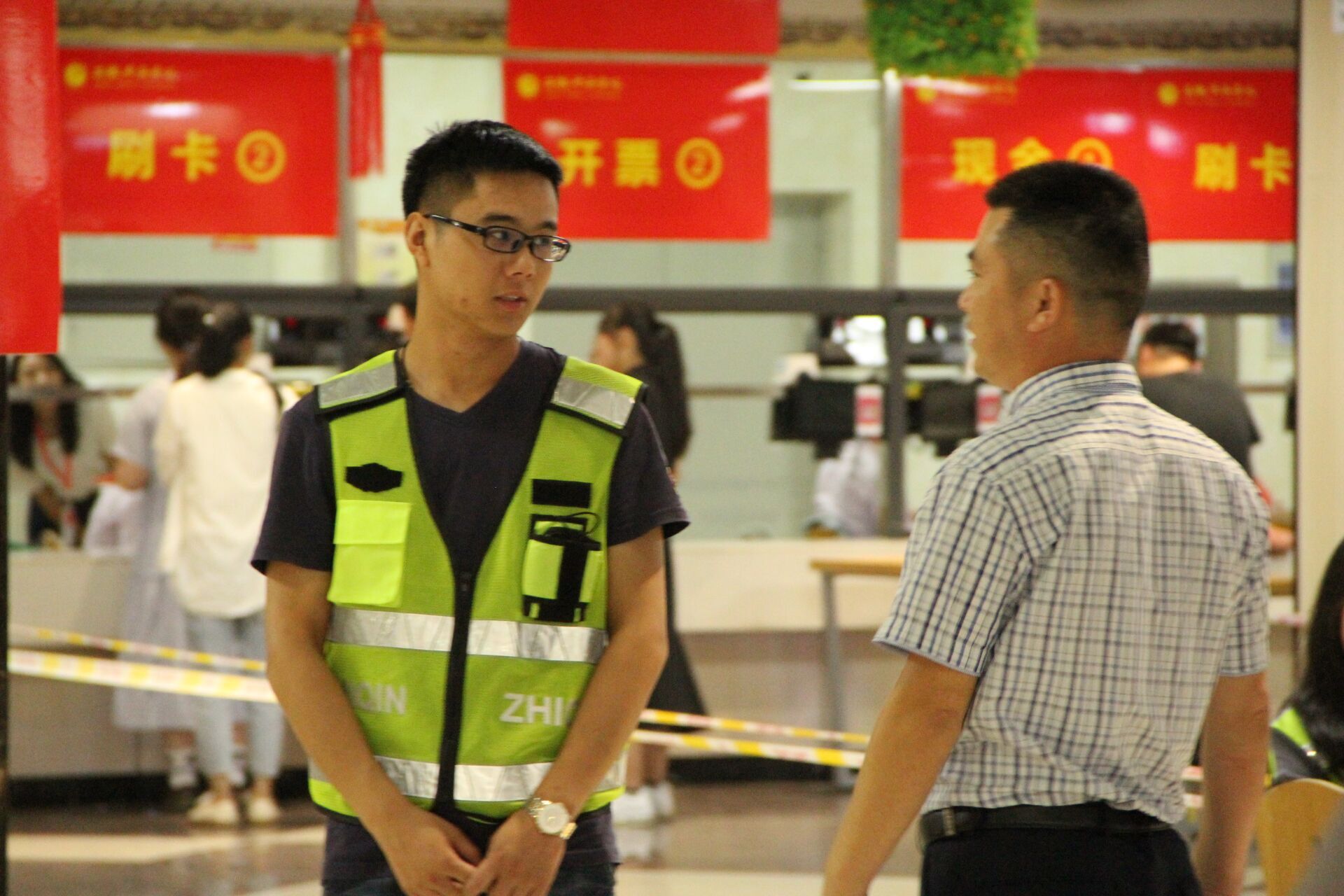 保障新生报到安全是护校队始终考虑的事: “为了更好接待新生,确保缴费大厅内的安全,护校队的任务就是用心‘盯’好每一道缴费窗口,应对紧急情况。”护校队成员孔孟凡介绍道。