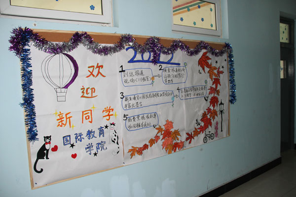 外国语学院的迎新主体展板使用了中、英、日三种语言