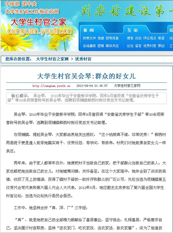 大学生村官之家网讯(通讯员 祝静静)近日,中国青年网下属网站大学生村之家官网一篇题为《大学生村官吴会琴:群众的好女儿》的新闻,报道了贝博官网优秀毕业生吴会琴在大学生村官工作中的先进事迹。