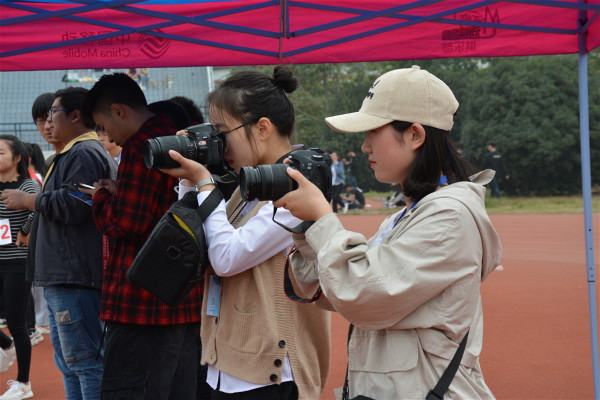 还有一群人,他们带着相机奔走在操场的各个角落,拍摄下比赛时的精彩瞬间。来自摄影工作室的周文静说:“在拍摄照片的过程中,拍摄对象不仅有努力比赛的运动员,还有给运动员加油助威的同学、默默无闻的志愿者、认真判罚的裁判员等等。无数次的拍摄才能获取一张满意的照片,虽然拍摄过程很艰难,但是只要用心总会记录下一些美好瞬间。”