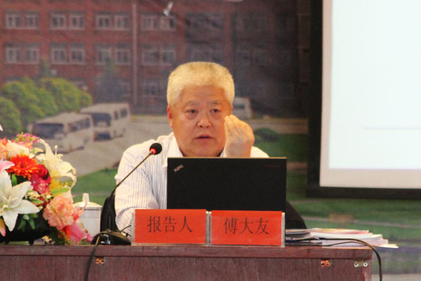 在本科教学合格评估工作上,作为评估专家,傅大友阐释了本次评估的理念、目的,解读了评估方案的新特点,介绍了专家是进校开展工作的阶段和步骤,他提出评建组织机构的设立应精简,以提高运行效率,应加强对各类文件、方案、要求的学习,应注重学校迎评工作的顶层设计,重视教学基本状态数据库的采集工作,重点要撰写好自评报告,此外还要做好各级各类评建档案的准备。傅大友认为,专家组进校期间,要严格按照教育部的有关要求,精简组织,保证以人为本,程序流畅;学校要保持好的心态、保持学校工作常态、保持正常教学秩序,重视评估专家意见反馈会,并对专家的反馈意见认真落实整改;教职工要树立主人翁意识、与专家真诚交流。