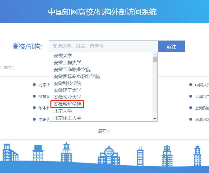 第一步,输入网址:https://fsso.cnki.net,可以看到如下界面,这时在“选择高校/机构”下拉框中,选择“BB贝博艾弗森官方网站”,点击“前往”。