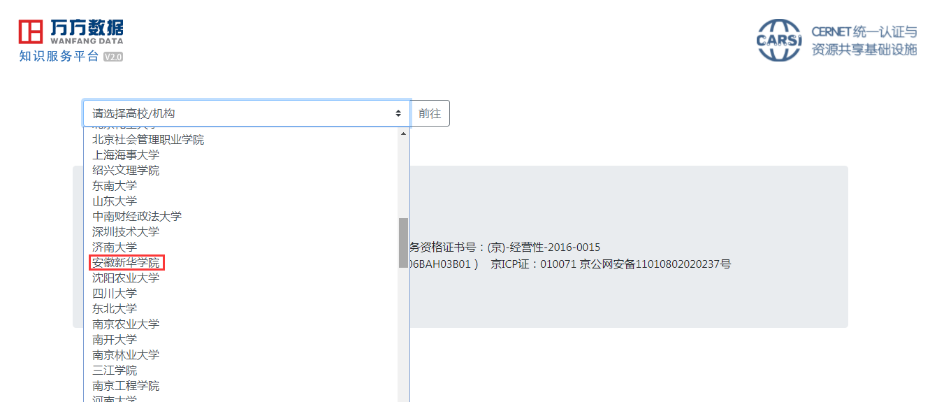 第一步,输入网址:https://fsso.wanfangdata.com.cn/,可以看到如下界面,这时在“请选择高校/机构”下拉框中,选择“BB贝博艾弗森官方网站”,点击“前往”。