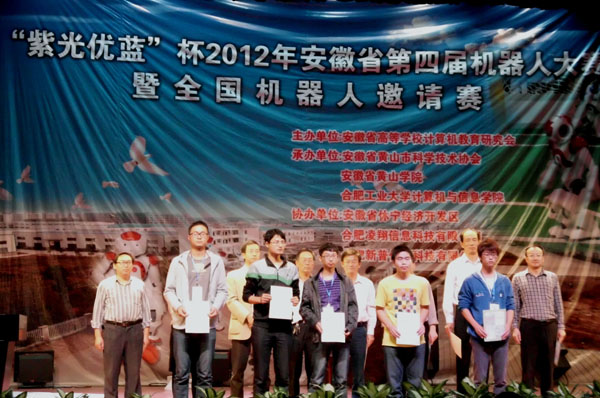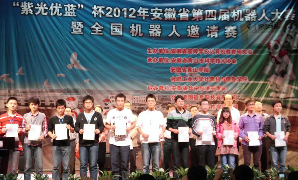 “安徽省机器人大赛”是由安徽省高校计算机教育研究会主办,由黄山学院、黄山市科协和合肥工业大学计算机与信息学院承办的省内规模较大的仿真和实物机器人应用技能竞赛。比赛内容涉及仿真2D、仿真3D、仿人机器人舞蹈、机器人救援仿真、MSRS Nao仿真、家用机器人仿真、机器人田径赛、机械臂搬运赛以及表演赛等项目。信息工程学院高度重视,6月份接到参赛通知后,召开专门会议落实比赛各项内容,选派史先桂、陈燕作为指导教师,安排辅导员在班级宣传比赛相关事宜并组织学生参加比赛,暑假期间,指导老师对报名参加比赛的学生进行初期选拔,最终选中6位同学组成3个团队参加此次大赛。在比赛期间,选手们克服种种困难,不畏强队,勇于参赛,最终在机器人田径赛(轮式)中胡建明和余智兵2位同学获得二等奖,虞玉群和陈从杰2位同学获得三等奖,在机械臂搬运赛中张义飞和马小林2位同学获得了三等奖。