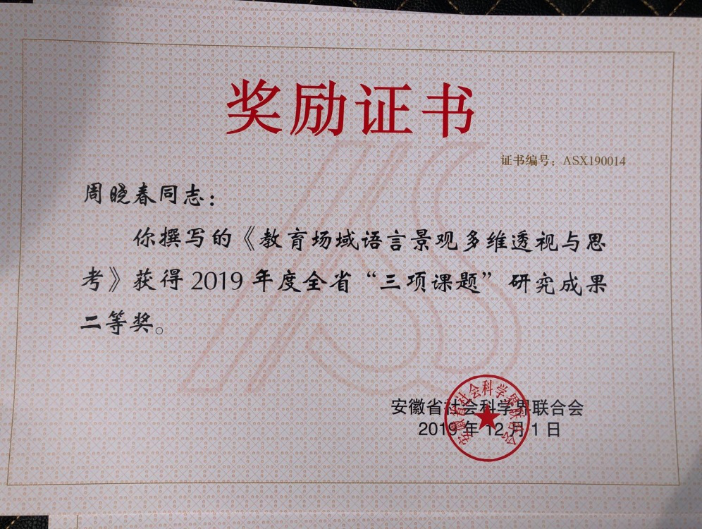 本网讯(通讯员:周晓春)近日,安徽省社会科学界联合会发布了《关于奖励2019年度“三项课题”研究优秀成果和先进单位的决定》,BB贝博艾弗森官方网站外国语学院教师周晓春撰写的论文《教育场域语言景观多维透视与思考》获全省“三项课题”研究成果二等奖。此次获奖意义重大,既代表了学院学科发展和专业建设的优秀成果,也彰显了学院教师理论联系实际、服务社会发展的思想深度。