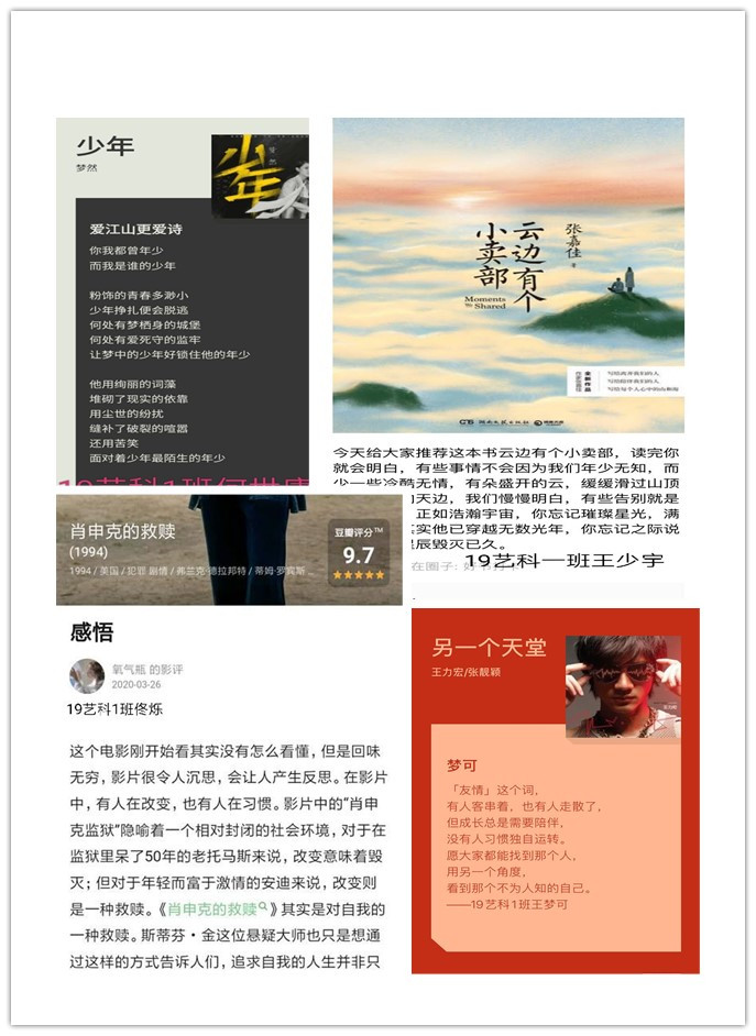 各类活动的开展受到学生们的积极响应,不仅引导学生们每天放下手机和游戏,站起来动一动缓解身体疲劳和释放心理压力,让学生们能够每天以元气满满的精神风貌完成线上课程的学习。影评、书评、音评的撰写不仅弥补了网络碎片化学习的空隙,通过班级群的发布更是加强了学生们间的交流,激发共同的兴趣爱好。此外,学生们还充分发挥想象力,“身宅心不宅”GET形式多样的新技能,记录成班级的“战疫”趣事,通过“新华艺院官微”发声,与广大同学们一起分享。