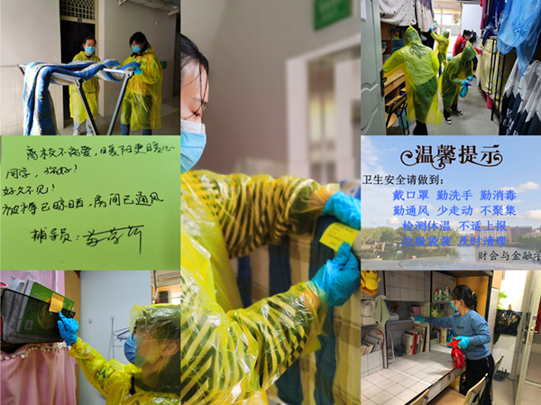 延期开学以来,财会与金融学院学工团队及时调整工作方向,积极搭建云端思政教育阵地,取得了良好效果。4月23日,辅导员们返校投入到“离校不离爱,暖阳更暖心”学生线上服务活动中来。大家通过网络收集学生需求,进行“云”接单,主动与宿管员一起深入学生宿舍,帮忙给学生宿舍开窗通风、清理卫生、晾晒被褥。辅导员们贴心地为学生擦拭阳台栏杆,翻晒被褥,并贴上宿舍温馨提示和爱心留言。日前,活动还在持续进行中,辅导员们继续根据学生需求,启动给宿舍植物浇水、倒垃圾、邮寄急需用品等多项服务。