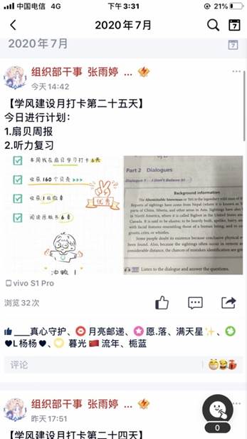 6月10日学风建设月的启动仪式召开后不久,外国语学院紧接着就开展了学习寄语的政绩活动,以短视频、文字或转发励志话语到朋友圈等方式表达对未来学习的期许,告别过去懒散、颓废的自己。通过小小的学习仪式感,让学生们作别坏习惯,养成立目标的好习惯。活动一经发布,受到了学生们积极参与。