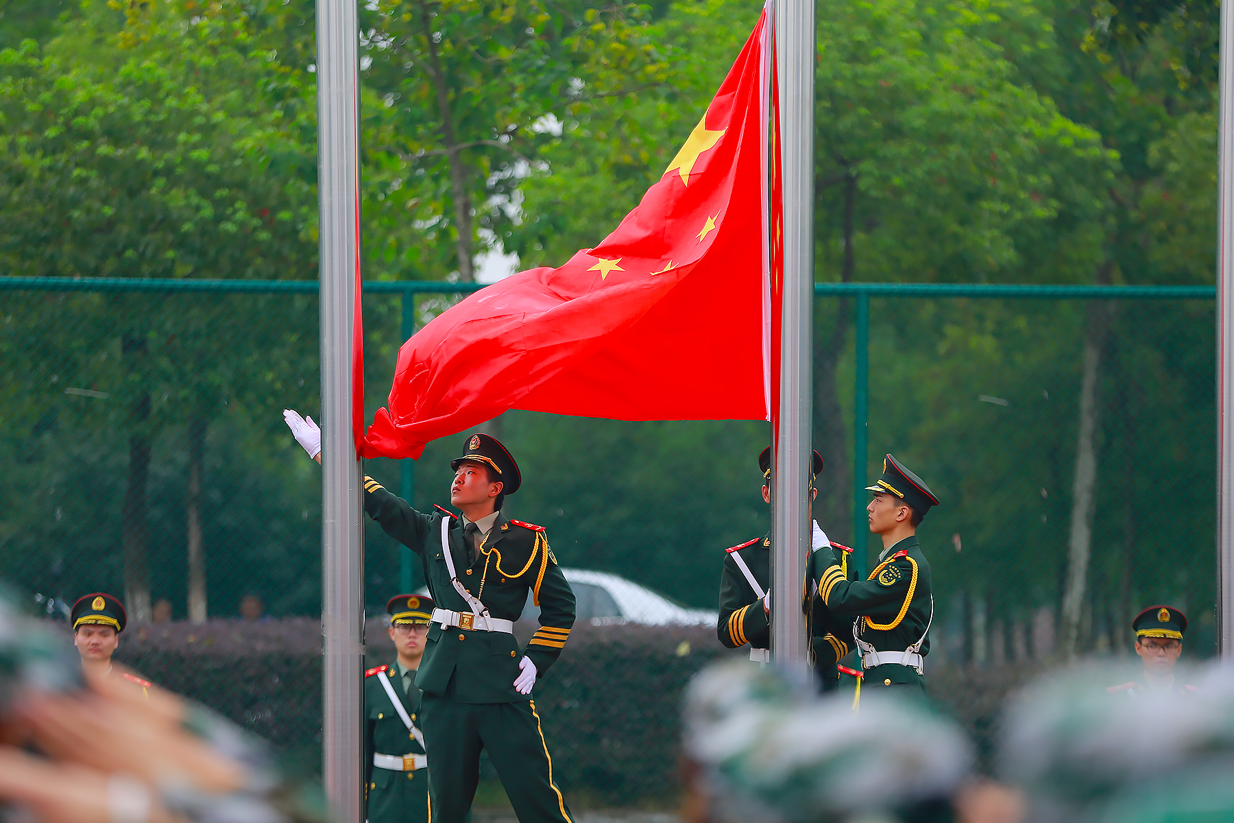 上午9时,开学典礼在雄壮的国歌声中拉开序幕。国旗护卫队旗手奋力将国旗展向天空,鲜艳的五星红旗荡出优美的弧线冉冉升起,全体师生面向国旗,升国旗、唱国歌。