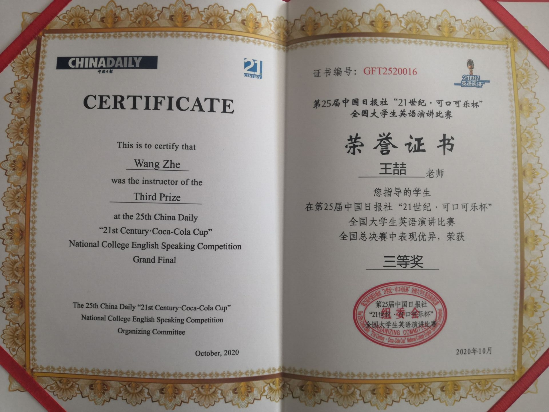 本网讯(通讯员:王喆)10月4日-10月7日,由中国日报社与可口可乐中国联合举办、二十一世纪英语教育传媒承办的第25届中国日报社“21世纪杯全国大学生英语演讲大赛”全国总决赛在广州白云国际会议中心举行,贝博官网参赛选手李航同学,在外国语学院王喆老师的指导下,获得全国三等奖的优异成绩。