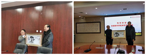 调研考察中,储董代表贝博官网分别向两所高校赠送了具有安徽特色的迎客松铁画。