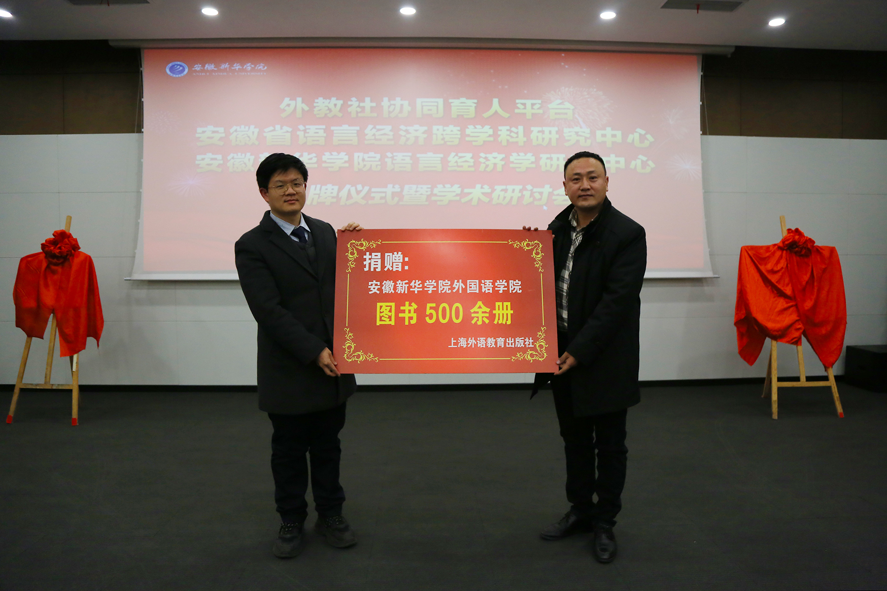 会上隆重举行了“安徽省语言经济跨学科研究中心”暨成立“BB贝博艾弗森官方网站语言经济学研究中心”揭牌仪式,随后还举行了外教社赠书仪式。