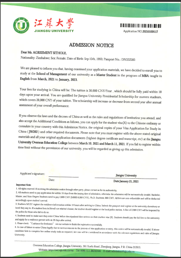 本网讯(通讯员:吴海峰)近日,贝博官网国际教育学院留学生AGREEMENT SITHOLE(中文名李桐)获江苏大学工商管理专业研究生录取,并获2万元奖学金。李桐为贝博官网首位获得境内高校研究生录取的留学生,这也标志着贝博官网“留学新华”项目取得新的重大突破。