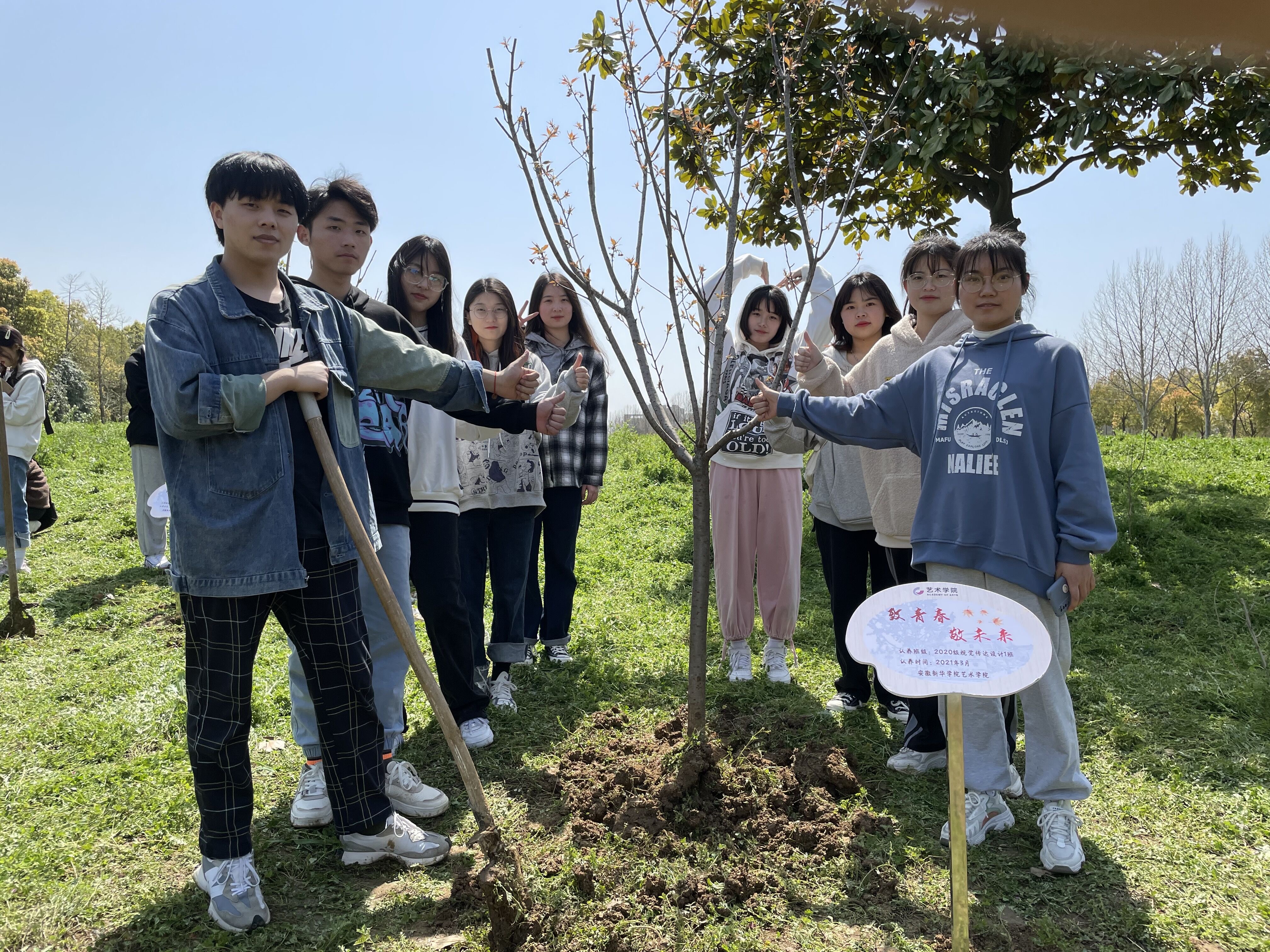 此次活动得到了艺术学院师生的热烈响应,作为全校实验班之一的2019级艺术与科技班级,带领2020级班级,以班级为名,购置了12株晚樱苗木。从树苗选购到绿地划分,从区域分割到前期设计,从植树到认养,从种植培土到日常维护,充分征询师生意见。